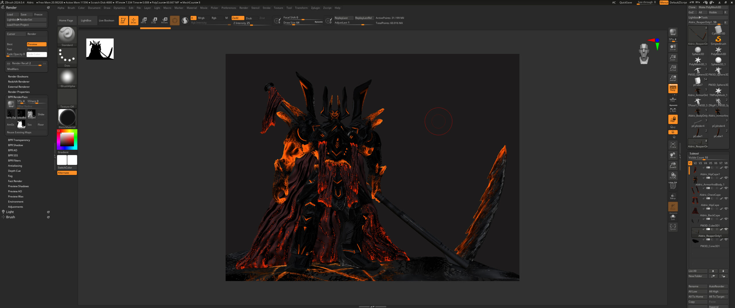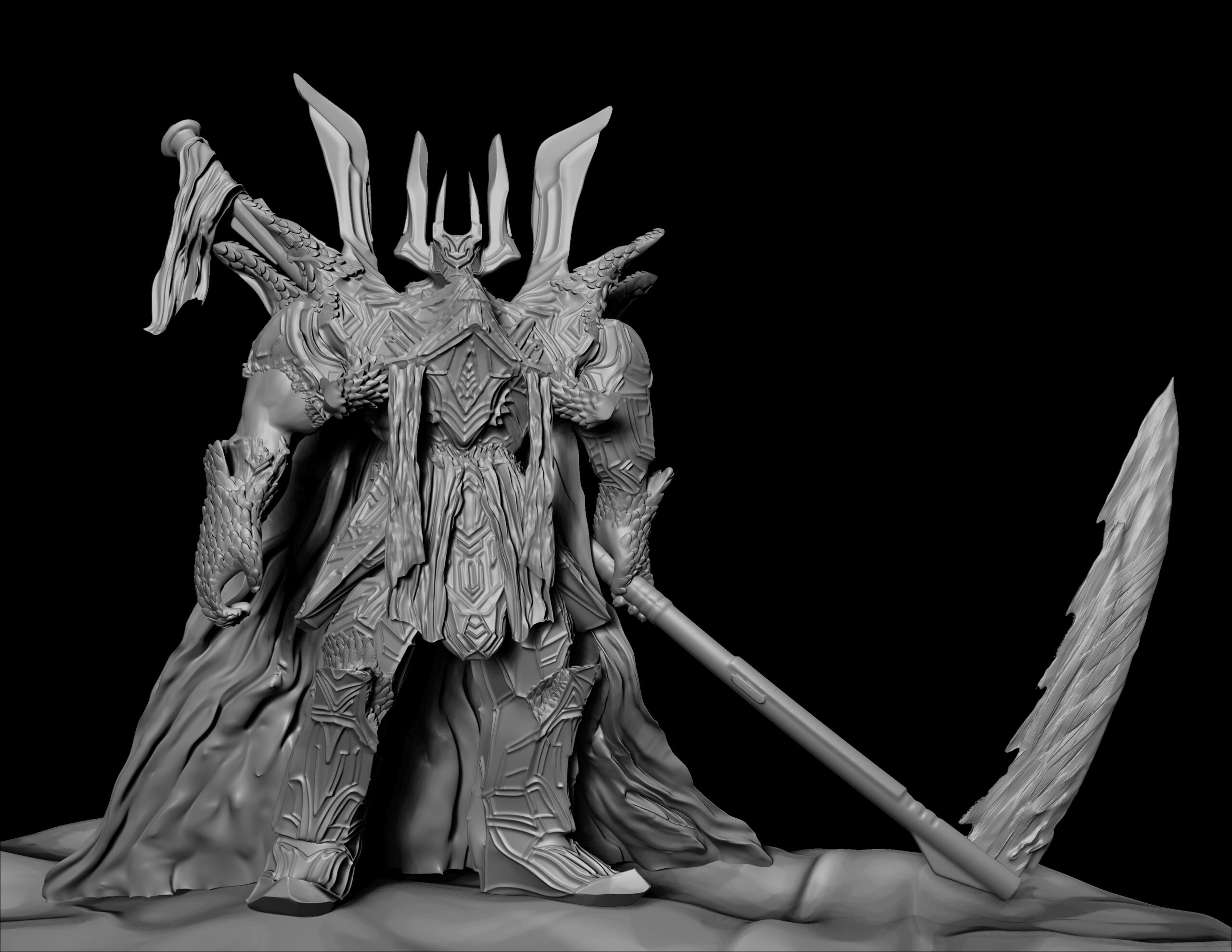 Das Semesterprojekt Eldrick war mein erster tiefer Einstieg in die Welt von ZBrush, bei dem ich meinen eigenen fiktiven Charakter entwickeln und zum Leben erwecken musste. Ziel war es, einen komplexen, glaubwürdigen Charakter mit einer einzigartigen Hintergrundgeschichte zu gestalten. Das Projekt legte den Fokus stark auf Sculpting, Shading und den kreativen Einsatz von Materialien. Neben dem Modellieren standen auch Storytelling und die Entwicklung einer kohärenten Backstory im Mittelpunkt. Sein Design sollte bedrohlich, episch und mystisch wirken, um seine Rolle als Todesfürst und Herrscher über das Reich der Schatten glaubhaft zu unterstreichen.