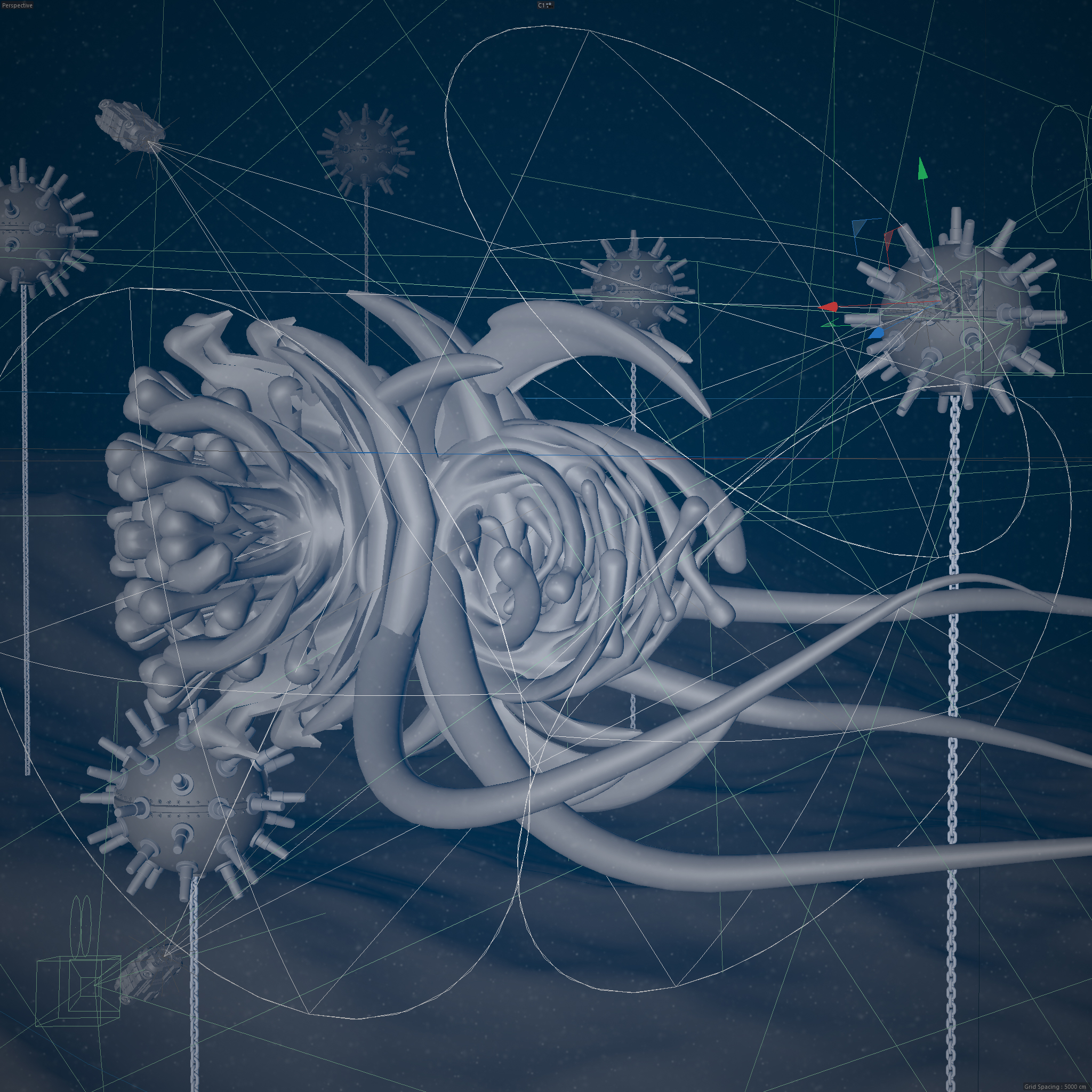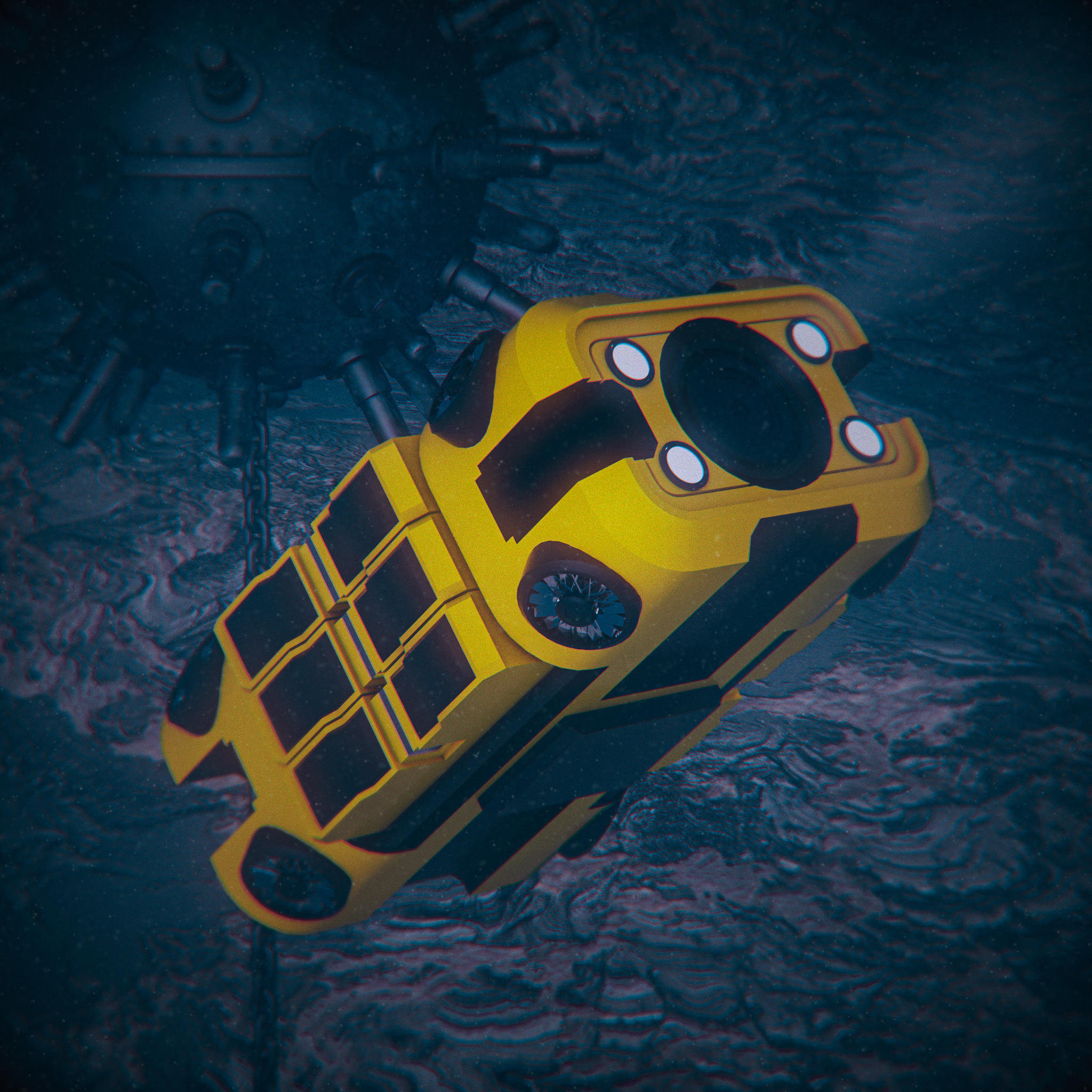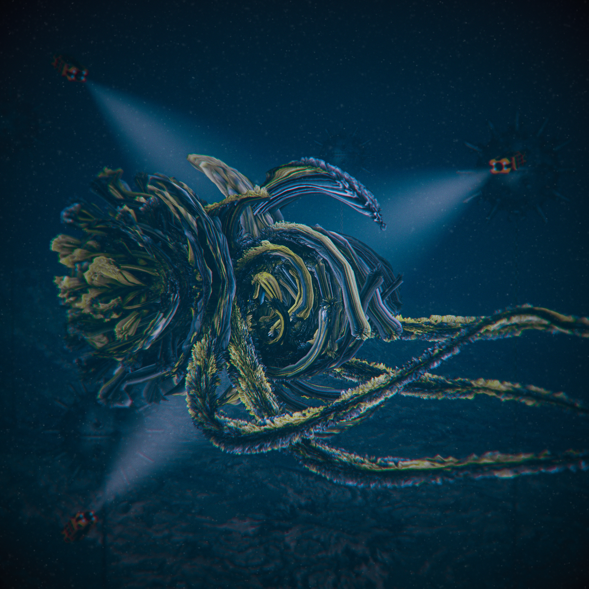 Dieses Werk zeigt eine mysteriöse Kreatur oder Struktur in den Tiefen des Ozeans, umgeben von Scheinwerfern kleiner Unterwasser-Drohnen. Die organischen, blütenähnlichen Formen wirken fremdartig und faszinierend zugleich. Die düstere Farbpalette und die subtilen Lichteffekte verstärken das Gefühl von Unbekanntem und Bedrohlichem – eine Hommage an die unendlichen Geheimnisse der Tiefsee.